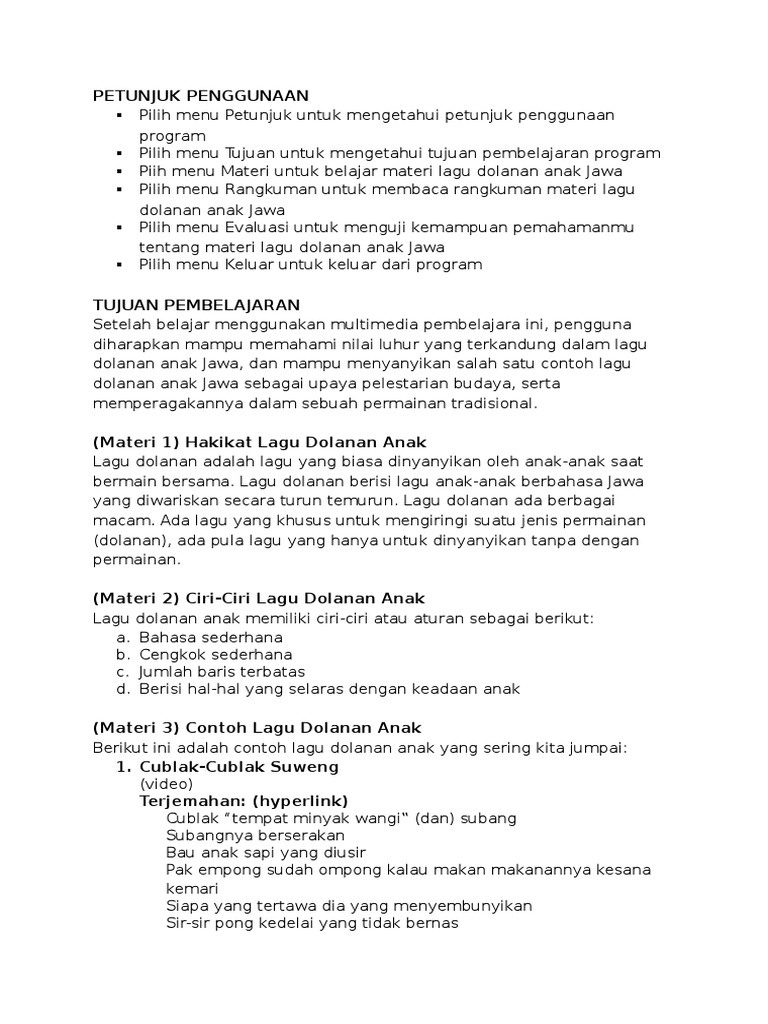 Bahan Flash 1 Pdf from imgv2-2-f.scribdassets.com Permainan ini memang mengajari tentang pencarian harta dalam hidup. Liriknya, suwenge teng gelenter memiliki arti berserakan, suweng tersebut merupakan kebahagiaan sejati sudah ada di sekitar manusia. By kisah nusantara february 3, 2016. By kisah nusantara february 3, 2016 lagu daerah jawa timur. Arti tembang cublak cublak suwengtempat anting perhiasan wanita jawaanting perhiasan yang berserakanbaunya dituju ke anak kerbaubapak yang ompong menengok ka. Lagu ini sendiri diciptakan oleh sunan giri, yang memiliki pesan moral sangat berharga yang terkandung pada tiap barisnya. Lirik lagu cublak cublak suweng. Bisa diartikan ayolah tebak tempat menyimpan harta