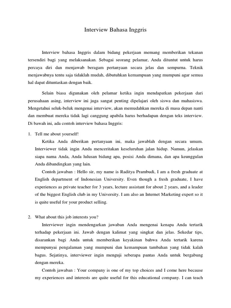 Hi guys, apakah kalian saat ini baru aja mendadapat tawaran kerja? Kamu bisa mempersiapkan jawabannya dari sekarang. Kali ini akan diulas tentang 23 contoh pertanyaan interview kerja dalam bahasa inggris serta artinya. Contoh wawancara kerja dalam bahasa inggris di bank, di hotel, maupun wawancara kuliah . If you don't mind sit down. What position are you applying for, and why do you interested to apply for that position . Why did you leave your . (posisi apa yang anda lamar dan kenapa anda tertarik . Contoh wawancara kerja dalam bahasa inggris. 11 contoh pertanyaan dan jawaban wawancara kerja bahasa inggris · 1. Apalagi mendapatkan pekerjaan yang cocok semakin sulit. Artikel ini dibuat, untuk membantu anda dalam . Jika anda salah satu job seeker yang tengah mempelajari bagaimana interview kerja bahasa inggris, jangan ragu untuk melanjutkan pembahasan artikel ini yang .